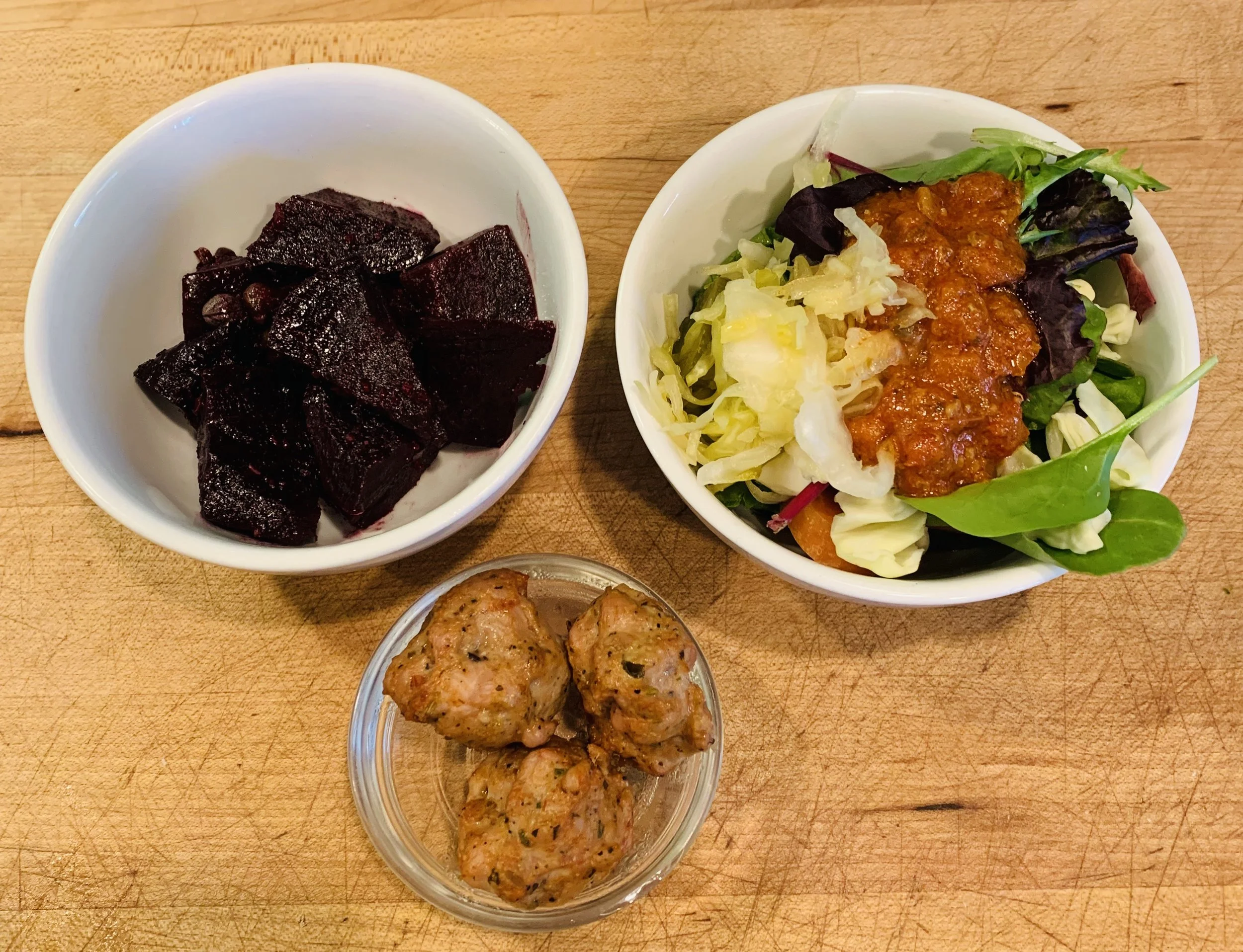Easy breakfast of leftover salad (topped with live slaw and salsa), roasted beets (with or without walnuts and feta) and turkey meatballs I formed into little meatballs and baked at 350 for 20 minutes. YUM! Nutritious and Delicious…