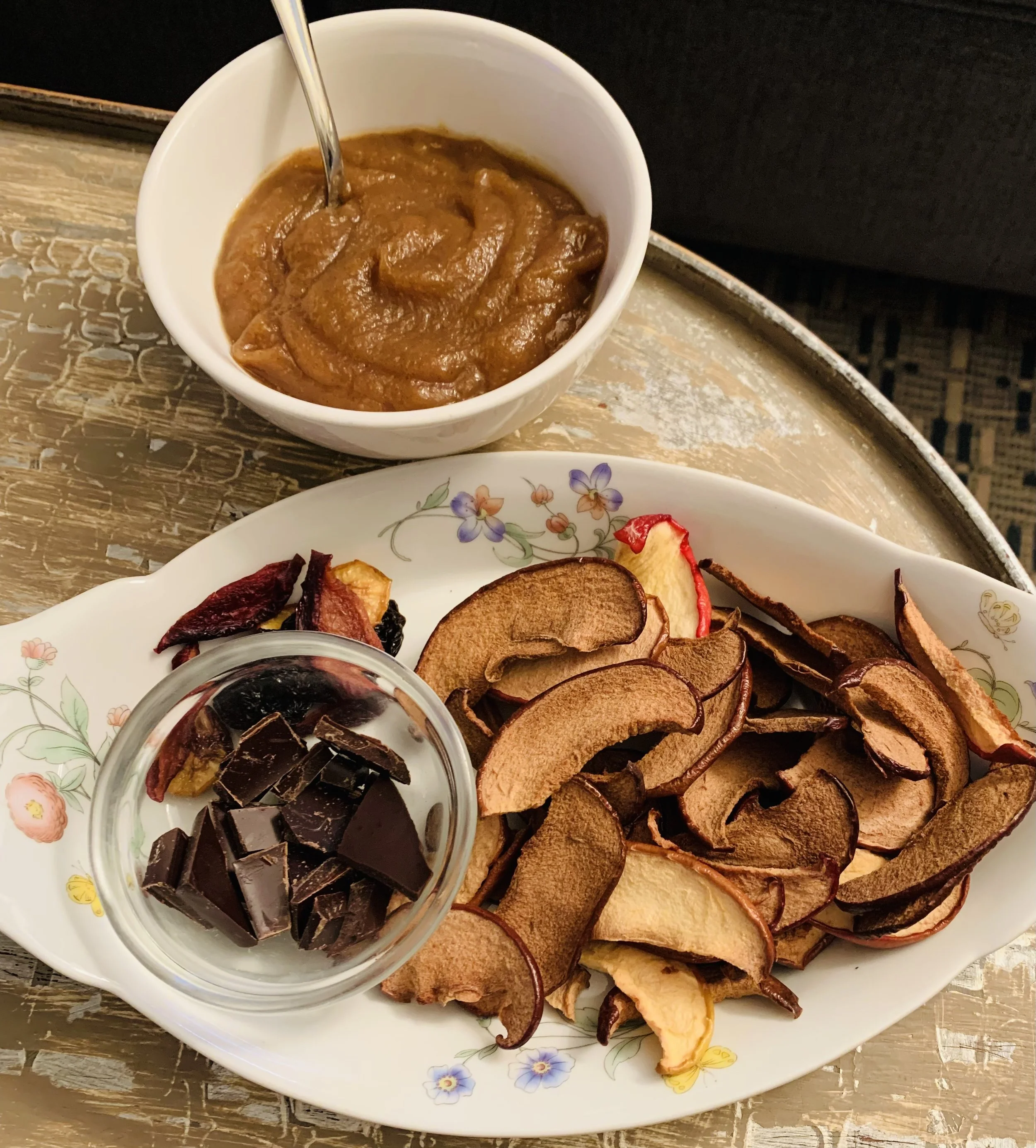 Chill or reheat and serve with fresh apples or apple chips, chocolate chips, dried cranberries, and chopped nuts.