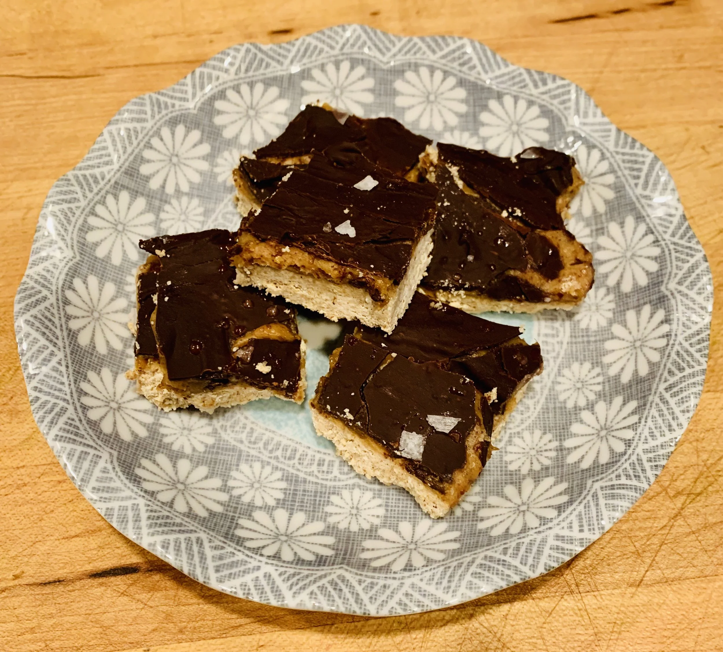 Melt chocolate in double boiler. Pour and spread over date layer. Sprinkle with flaky sea salt.