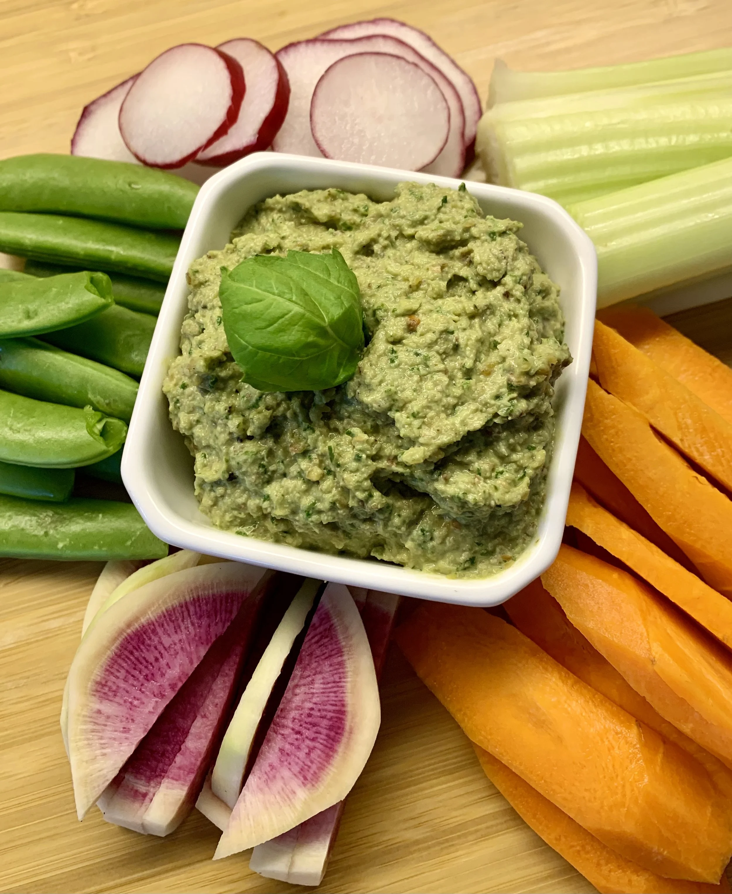 In a food processor, start by blending the almonds and garlic, then add the next 3 ingredients and then the lemon and olive oil.