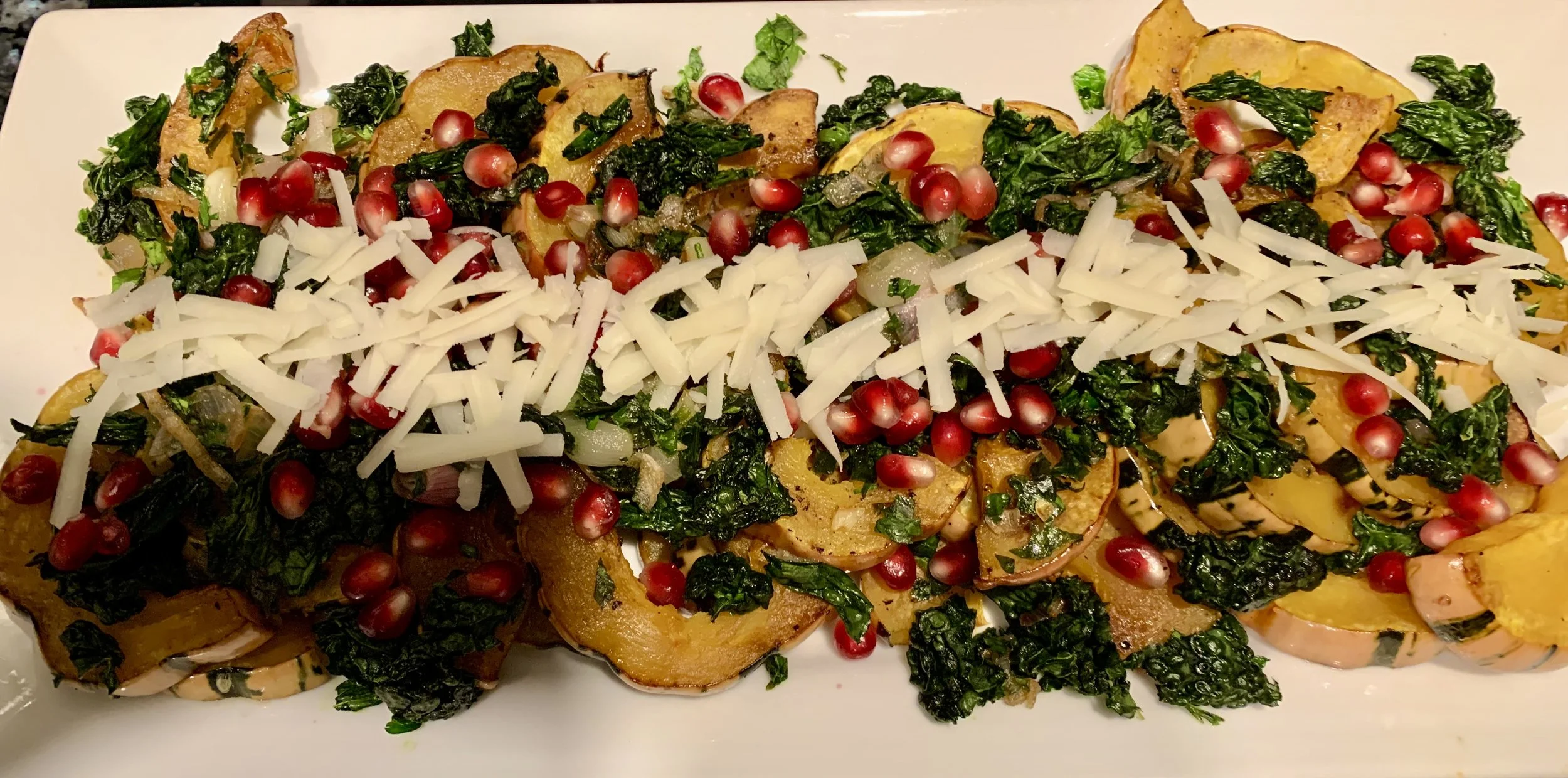 Arrange squash on a platter, sprinkle with veggies and then pomegranate and if desired cheese.