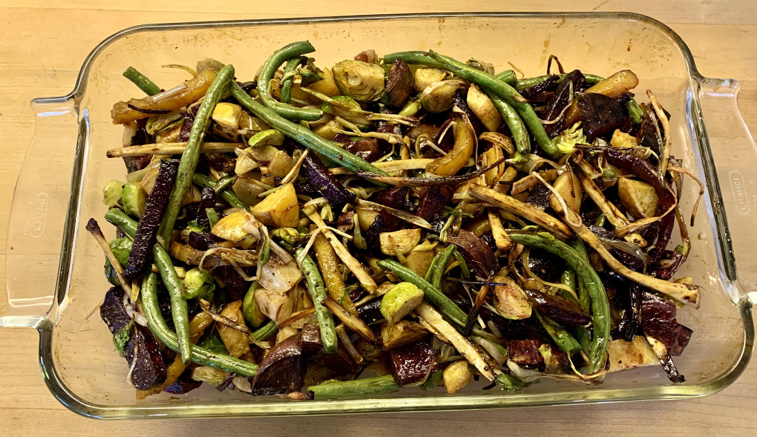 Keep adding vegetables as they are done and when everything is roasted, add remaining olive oil and balsamic, seasonings, and place in a large pyrex dish covered with tinfoil.