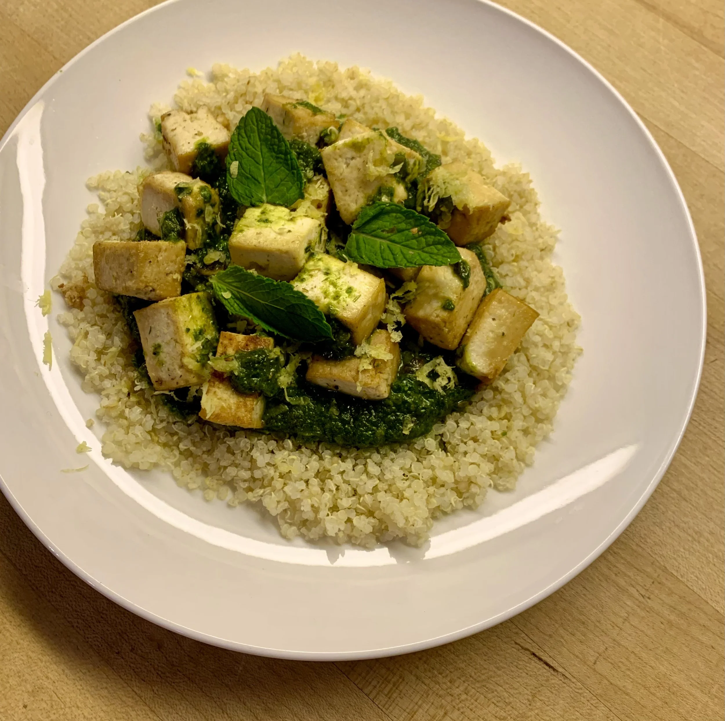 Serve the spinach mixture over or next to cauliflower rice or quinoa or rice, add tofu, lemon zest and mint leaves.