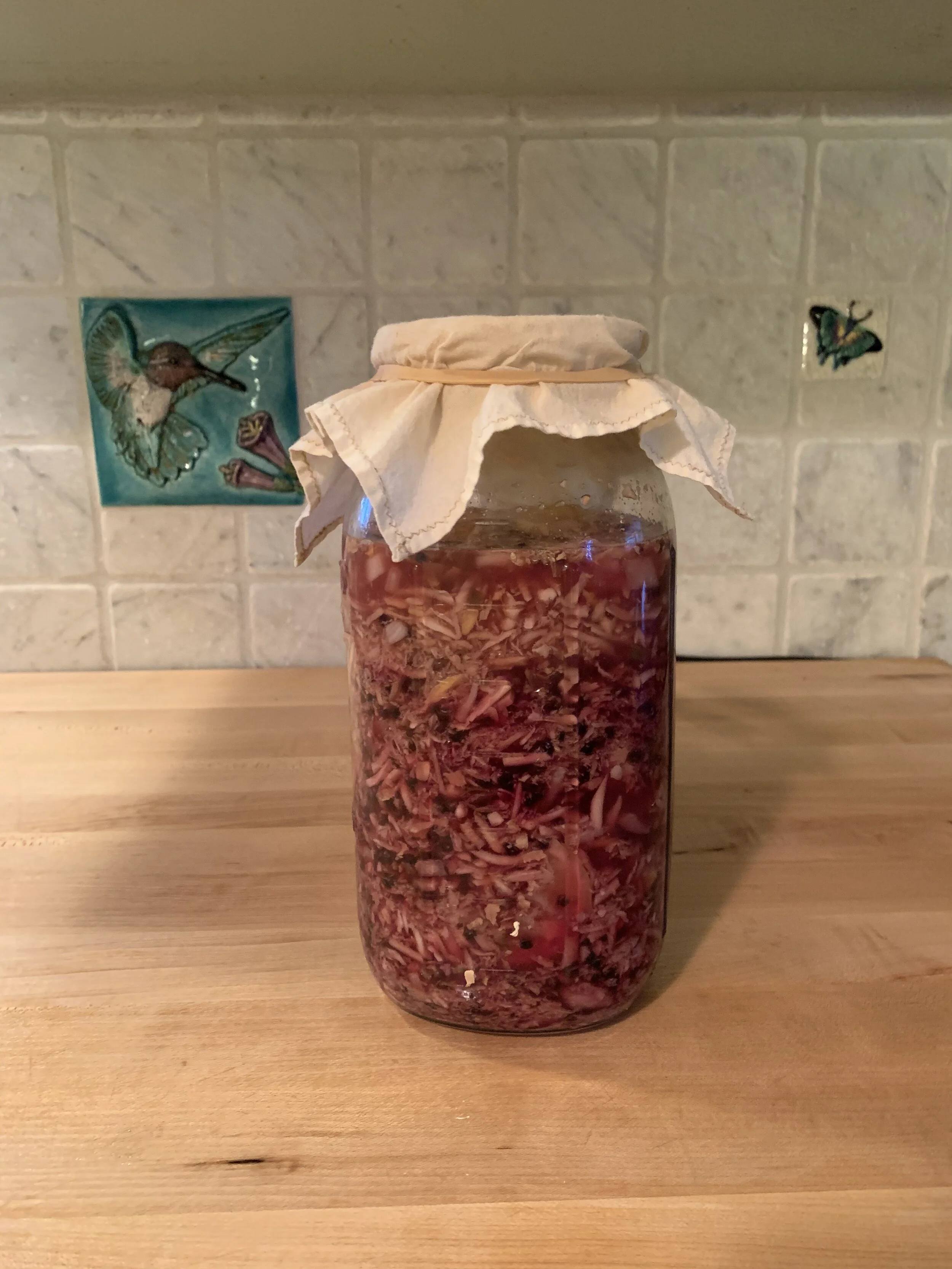 Cover with the apple cider vinegar and cover the top of the jar with a breathable piece of cloth or paper towel, securing it with a rubber band.